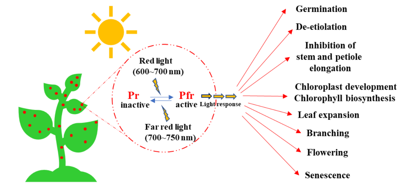 Seeds exposed to red light convert Pr to Pfr which switches on amylase-producing genes. Amylase breaks down starch to fuel germination.