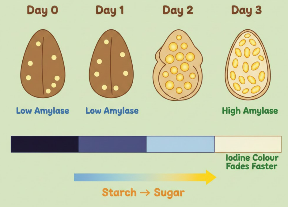 When cereal grains such as barley or wheat begin to germinate, they start producing amylase. This enzyme breaks stored starch into sugars that fuel the embryo’s early growth. This practical tracks how amylase activity changes over the first few days of germination.