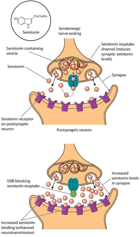 - SSRIs block reuptake pumps so serotonin stays longer in the synapse.