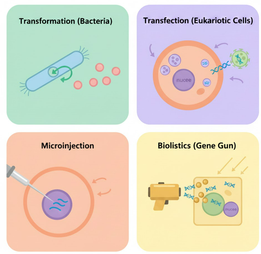 | Microinjection | Animal/plant embryos | DNA injected directly into nucleus | Transgenic animals |