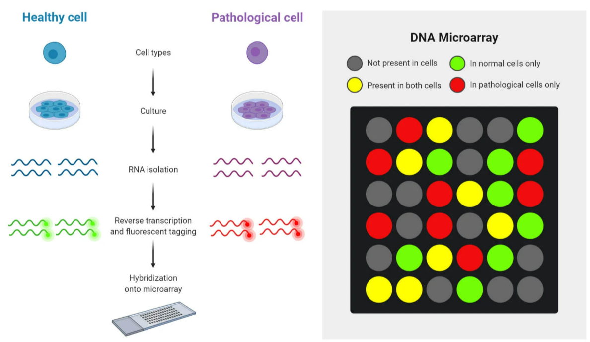 - Microarrays can compare gene activity between healthy vs diseased cells, different stages of development, or cells under different conditions (e.g., stressed vs normal).