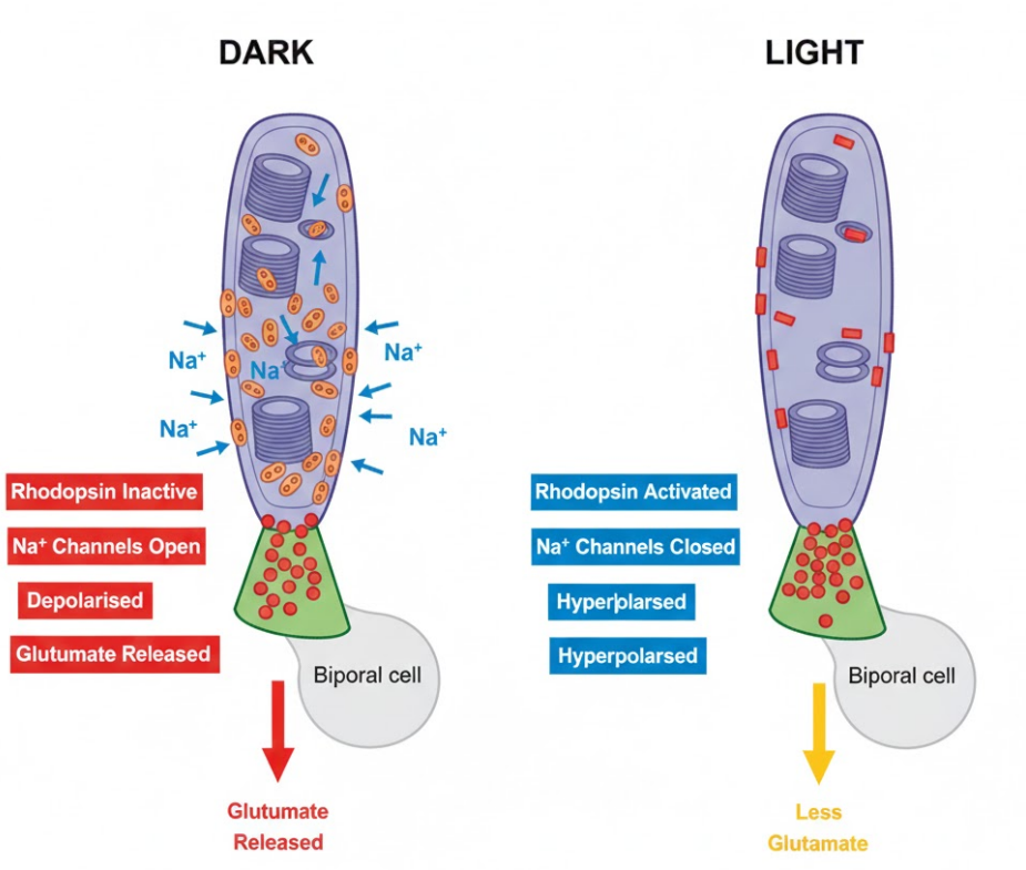 Dark: Na⁺ enters → depolarised → neurotransmitter inhibits bipolar cells.