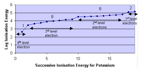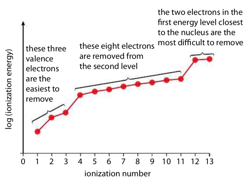 Furthermore, the number of electrons removed before the large jump corresponds to the number of electrons in the outer shell.