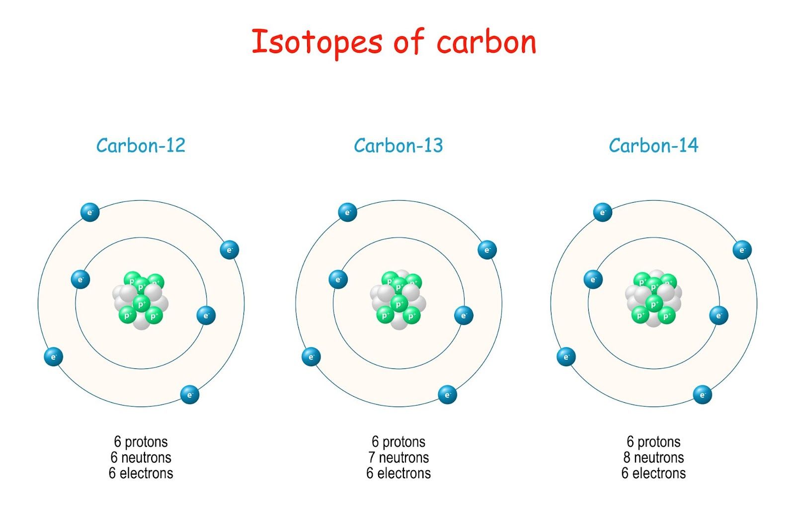 All three isotopes contain 6 protons, but they contain different numbers of neutrons:
