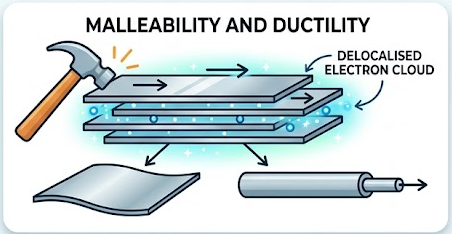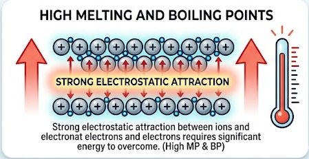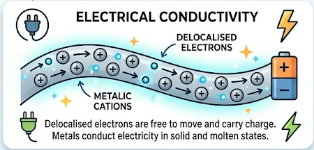 Therefore, metallic bonding explains the key physical properties of metals through the interaction between ions and delocalised electrons.