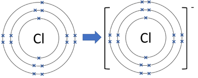 | \( \mathrm{Cl^-} \) | Gains 1 electron | ![]() | 7 original electrons (dots) + 1 gained (cross) |