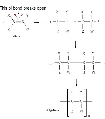 The π bond in the alkene breaks, allowing monomers to link together into a long chain.