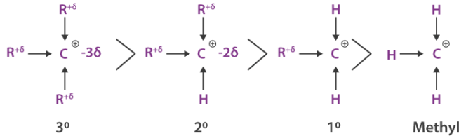 - Alkyl groups donate electron density, reducing the positive charge on the carbon.