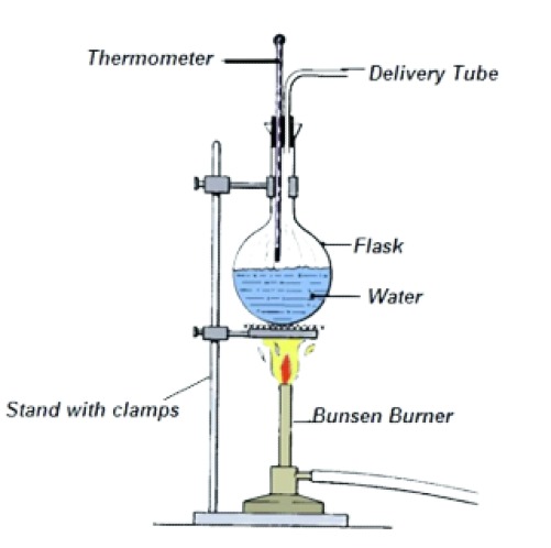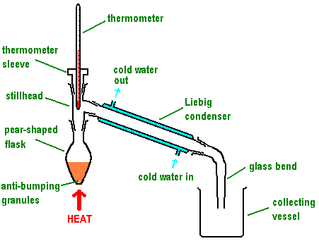 - The mixture is heated in a distillation flask fitted with a thermometer and condenser.