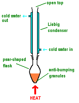 - The apparatus consists of a round-bottom flask connected to a vertical condenser.