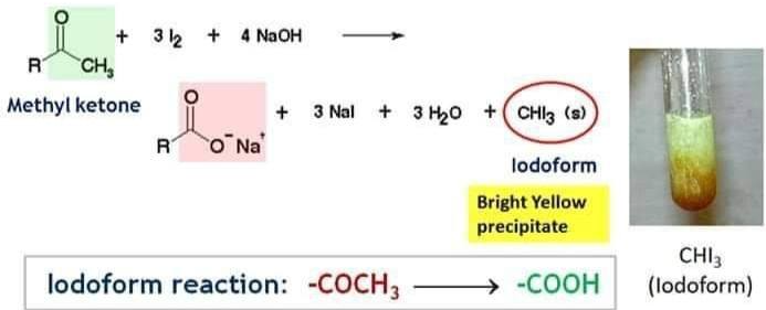 - Warm with iodine + \( \mathrm{NaOH} \)