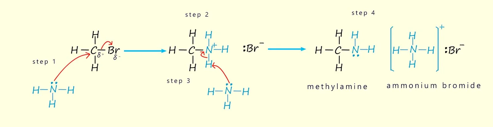 Example: \( \mathrm{CH_3CH_2Br + NH_3 \rightarrow CH_3CH_2NH_2 + HBr} \)