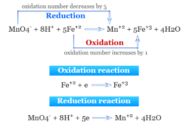 Reduction: \( \mathrm{MnO_4^- + 8H^+ + 5e^- \rightarrow Mn^{2+} + 4H_2O} \)