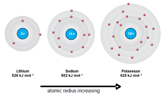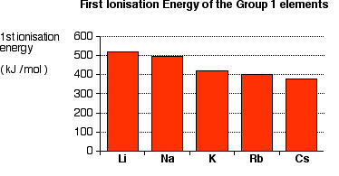 - First ionisation energy decreases down Group 1.