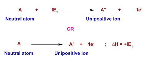 The energy required to remove one electron from each atom in one mole of gaseous atoms to form one mole of gaseous 1+ ions.