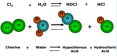 \( \mathrm{Cl_2 + H_2O \rightleftharpoons HCl + HClO} \)