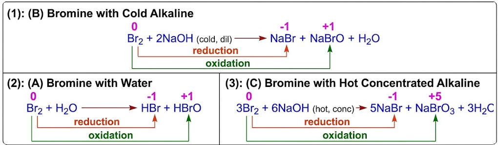 | \( \mathrm{Br_2} \) | \( \mathrm{Br^- + BrO^-} \) | \( \mathrm{Br^- + BrO_3^-} \) |