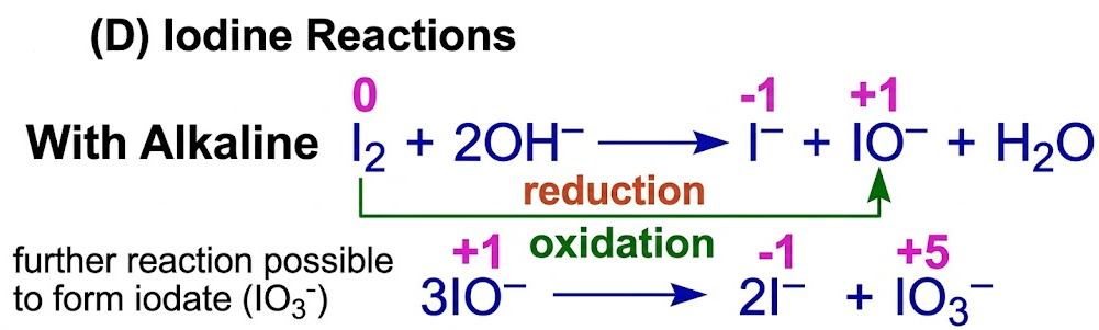 | \( \mathrm{I_2} \) | \( \mathrm{I^- + IO^-} \) | \( \mathrm{I^- + IO_3^-} \) (limited) |