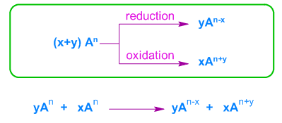 A disproportionation reaction is a special type of redox reaction in which the same element in a single species is both oxidised and reduced simultaneously.
