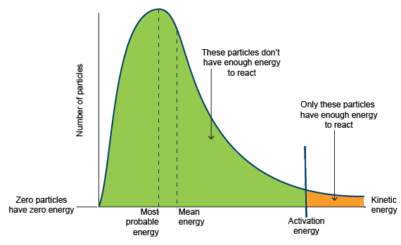 - The area under the curve to the right of this line represents particles with sufficient energy to react.