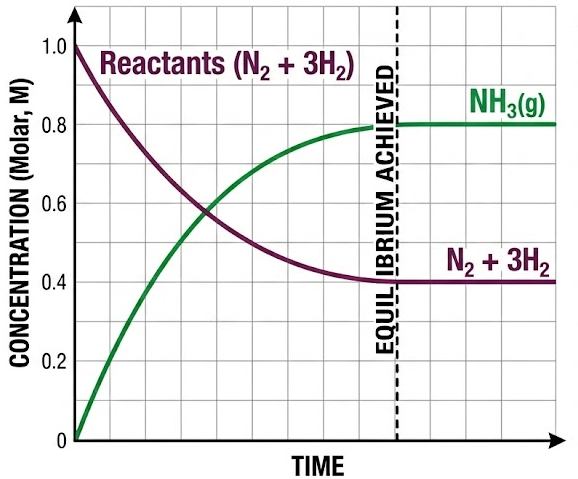 - The concentrations of \( \mathrm{N_2} \), \( \mathrm{H_2} \), and \( \mathrm{NH_3} \) become constant at equilibrium.