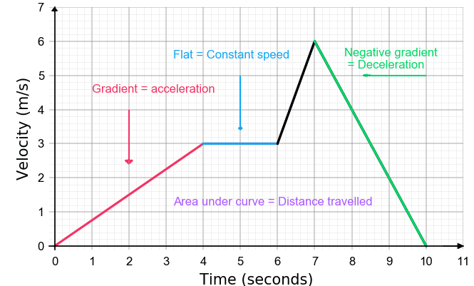 - The gradient gives acceleration: \( \mathrm{a = \dfrac{dv}{dt}} \)