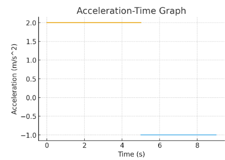 An a–t graph shows a constant value of \( \mathrm{2\,m\,s^{-2}} \) for 5 s, followed by a constant value of \( \mathrm{-1\,m\,s^{-2}} \) for 4 s.