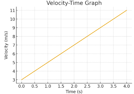 A v–t graph forms a straight line increasing from \( \mathrm{3\,m\,s^{-1}} \) at \( \mathrm{t=0} \) to \( \mathrm{11\,m\,s^{-1}} \) at \( \mathrm{t=4\,s} \). Find the acceleration and displacement.