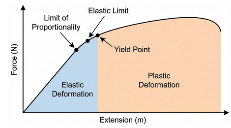 b) understand the terms limit of proportionality, elastic limit, yield point, elastic deformation and plastic deformation and be able to apply them to these graphs
