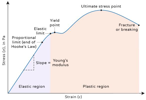 - Linear (elastic) region: Stress is proportional to strain. Young modulus is constant.