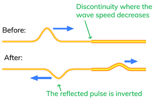 When a wave meets the boundary between two different media, part of the wave is transmitted into the second medium and part is reflected back into the first medium. This behaviour occurs for all types of waves: light, sound, water waves, seismic waves, etc.