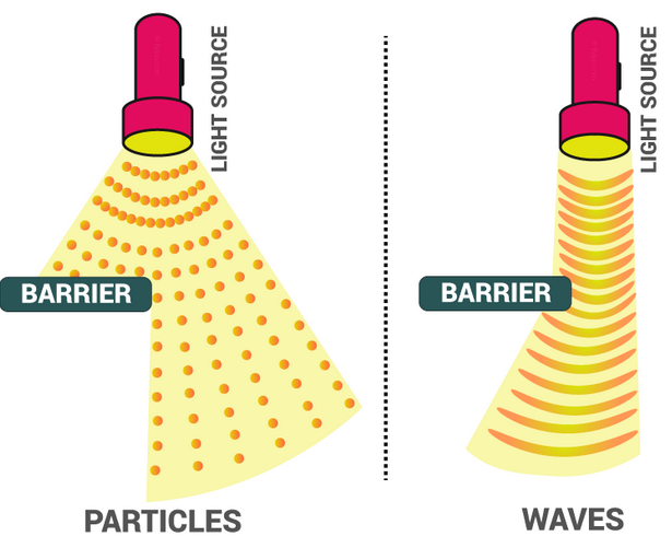 - Light behaves like a wave when travelling or interacting with slits/barriers.