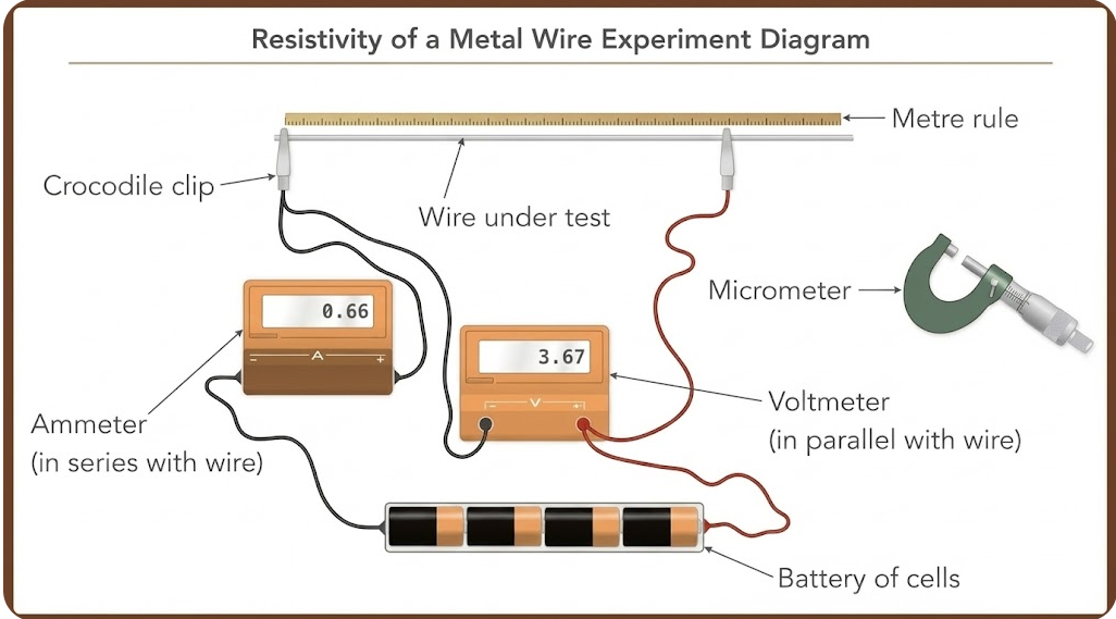 This practical determines the resistivity \( \rho \) of a wire using measurements of its resistance, length, and cross-sectional area. The key equation is: