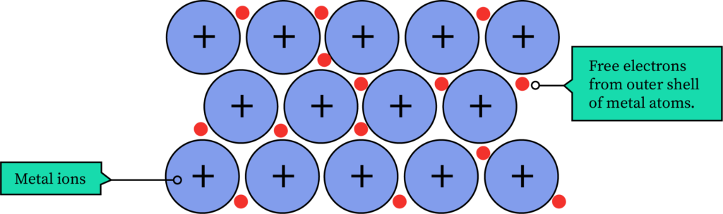 In metals, conduction is due to free electrons moving through a lattice of positive ions.