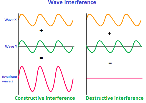 - Destructive interference (out-of-phase overlap → cancellation)