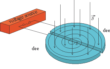 - An alternating voltage is applied between the dees.