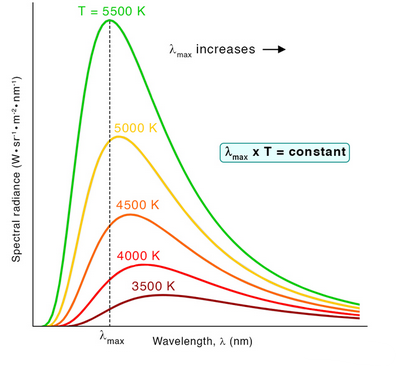 - be able to use Wien’s law equation \( \lambda_{\text{max}} T = 2.898 \times 10^{-3}\ \text{m K} \) for black body radiators