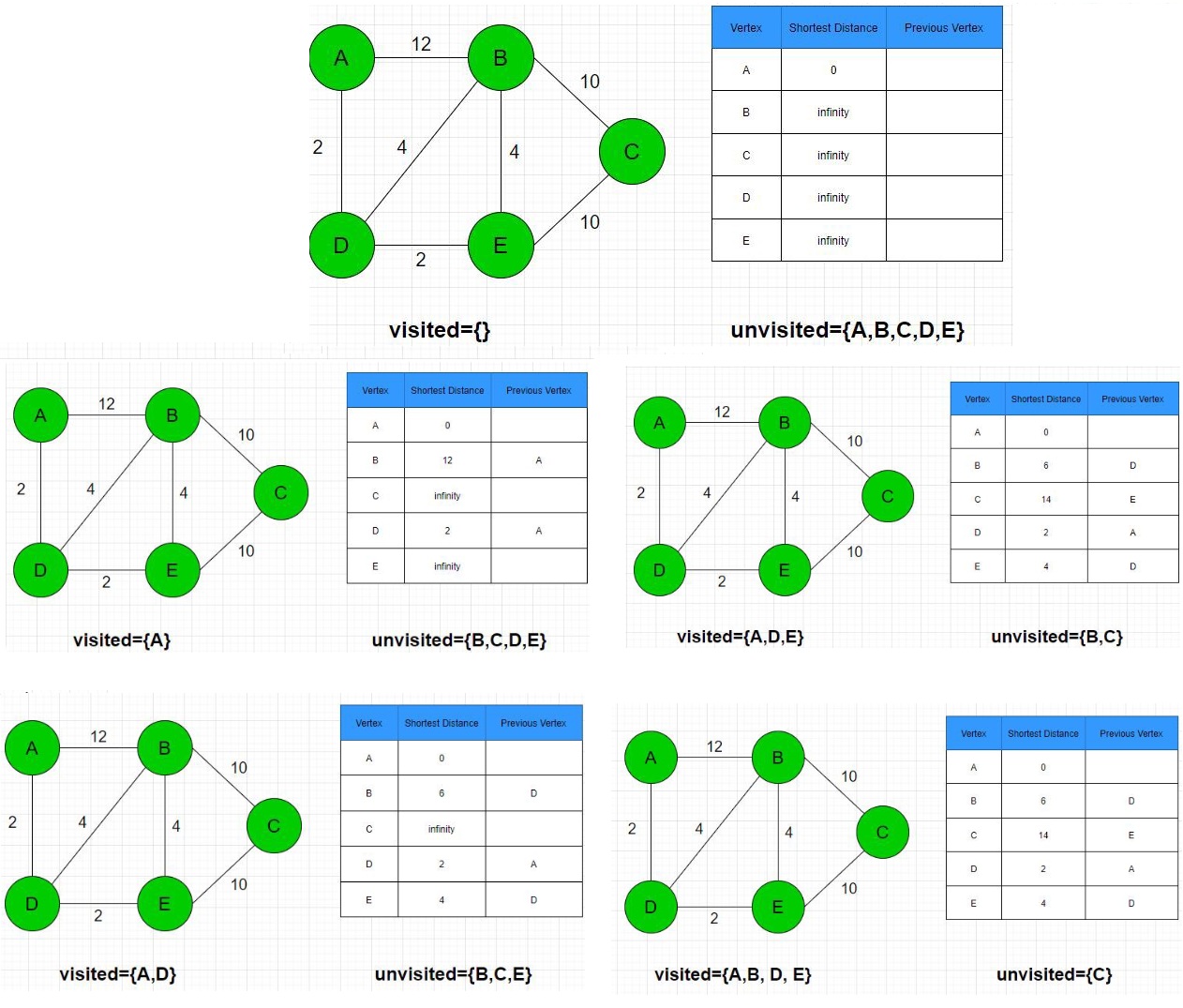| Vertex | Distance | Predecessor |