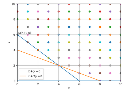 Solving \( \mathrm{x + y = 6} \) and \( \mathrm{x + 2y = 8} \) gives \( \mathrm{(4,2)} \).