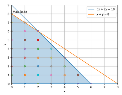 Solving \( \mathrm{3x + 2y = 18} \) and \( \mathrm{x + y = 8} \) gives \( \mathrm{(2,6)} \).