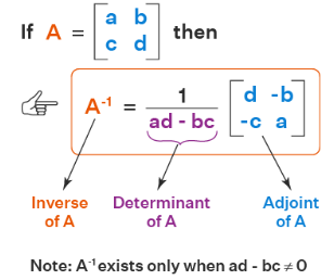 \( A^{-1} = \dfrac{1}{ad – bc} \begin{pmatrix} d & -b \\ -c & a \end{pmatrix} \)