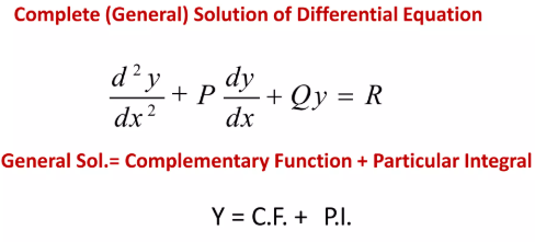 - Complementary function (CF): solves the homogeneous equation \( ay” + by’ + cy = 0 \).