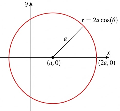 | \( r = 2a\cos\theta \) | Circle with centre \( (a,0) \) and radius \( a \) | |