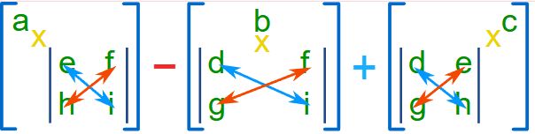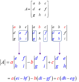 \( |A| = a(ei – fh) – b(di – fg) + c(dh – eg) \)