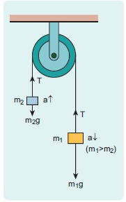 Two particles may be connected by a light inextensible string. The string is assumed to pass over a smooth fixed pulley or peg, so that the tension is the same throughout the string.