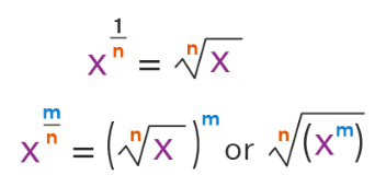 | Rational Index | \( a^{\dfrac{m}{n}} = \sqrt[n]{a^m} \) |