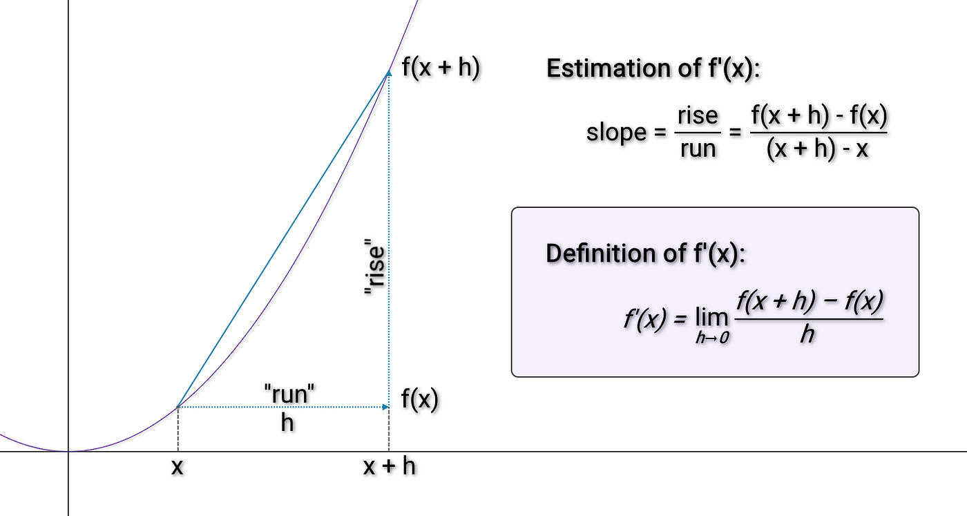This measures the gradient between points \( x \) and \( x+h \) on the curve and then lets \( h \) shrink to zero.