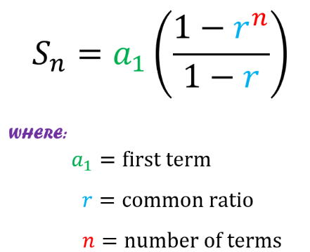 \( S_n = \dfrac{a(1 – r^n)}{1 – r} \)