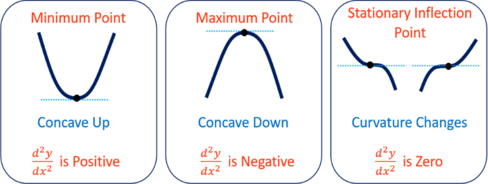 - \( \dfrac{d^2y}{dx^2} > 0 \) → minimum point