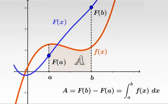 \( \displaystyle \int_a^b f(x)\,dx = F(b) – F(a) \)